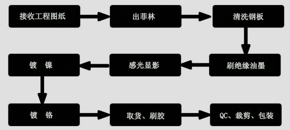 接收工程圖紙(AI、PDF或CAD格式均可)→出菲林→清洗鋼板→刷絕緣油墨→感光顯影→鍍鎳→鍍鉻→取貨刷膠→QC、裁剪、包裝