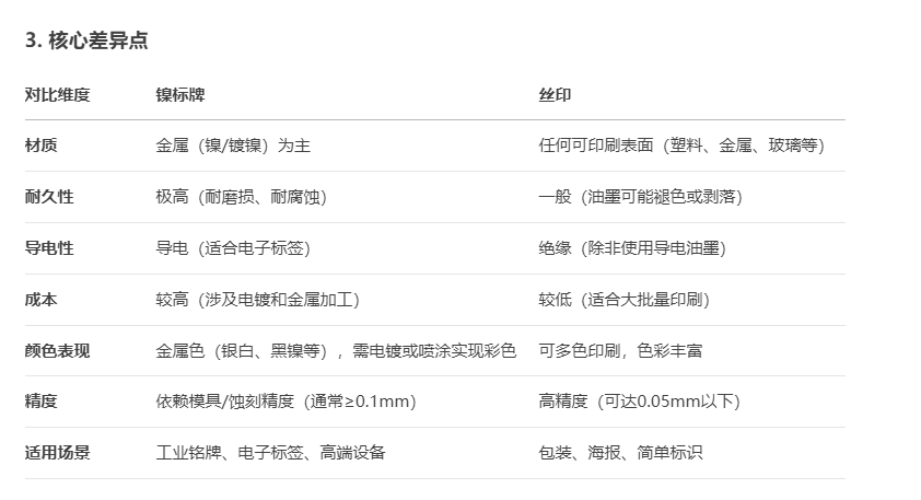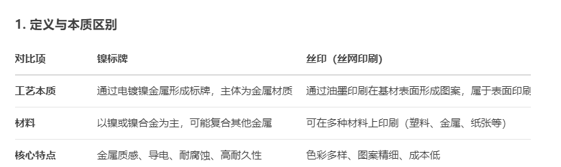 鎳標牌和絲印(絲網印刷)是兩種完全不同的工藝,用途、制作方式和最終效果都有顯著區別。以下是它們的核心差異對比: