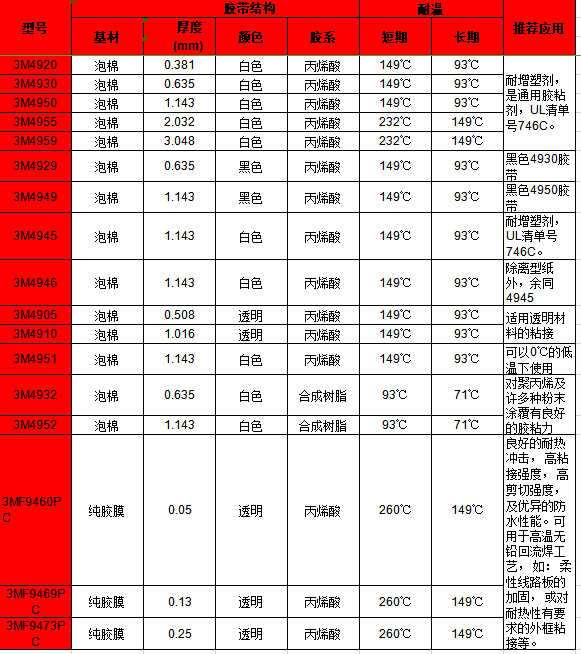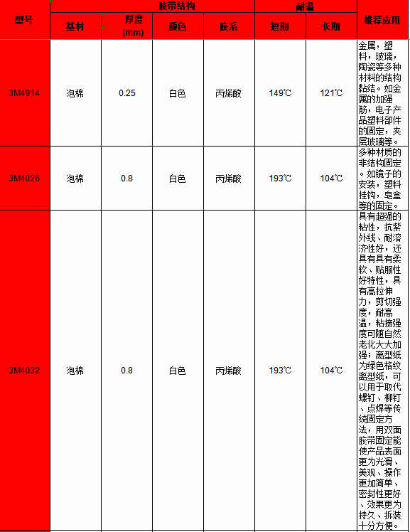 (以上是3M 4914、3M 4026、3M 4032相關(guān)型號特點(diǎn)說明)